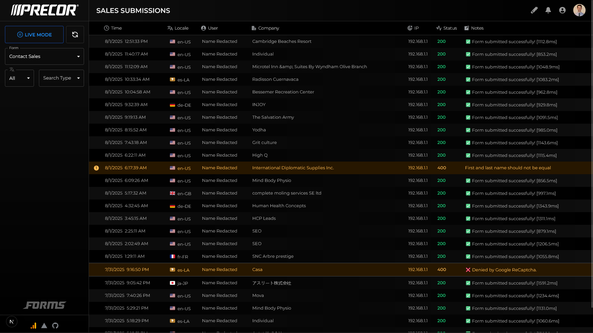 One of my proudest accomplishments at Precor, this form handler is a full-stack web application that securely processes each and every one of Precor.com's web forms. Built in response to a desperate need of an updated form handler, this app leverages NextJS's API routes to facilitate a fast, elegant solution that intakes form data, encrypts and logs it to Supabase, validates it against a predefined schema generated by components in Contentful, then either sends it off to Precor's Salesforce backend, or leverages AWS Simple Email Service to send it directly to one of Precor's Sales inboxes. This app filled a major gap in Precor's form security, and visibility of submissions by the Marketing department.